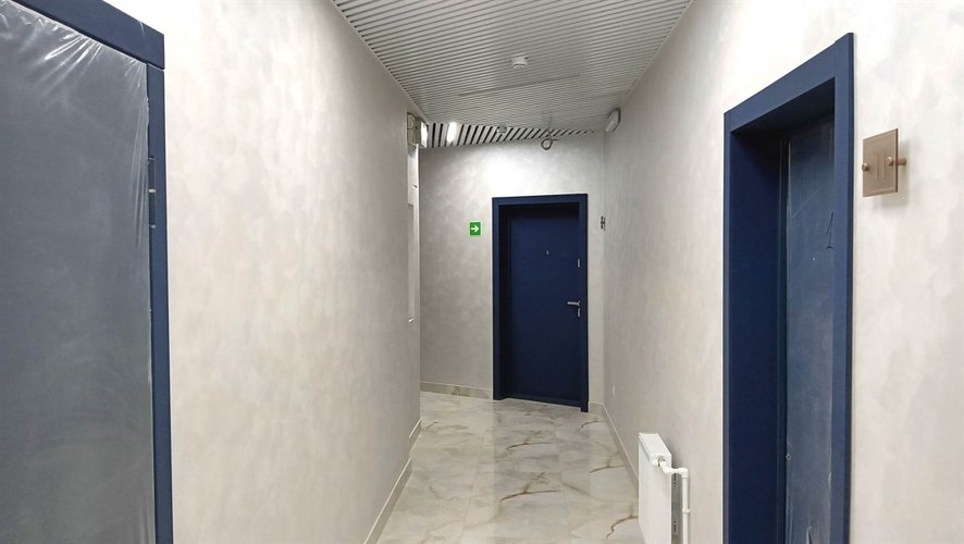 box: стены выровнены, оштукатурены, ошпаклеваны и обеспылены, на полу
